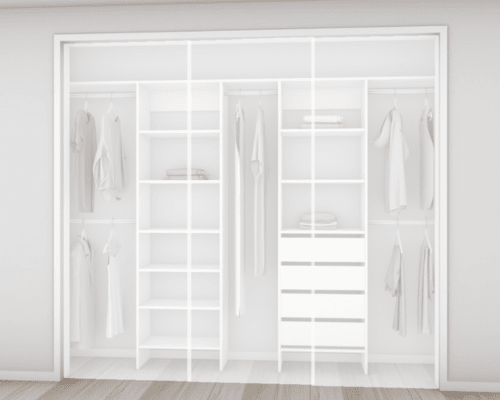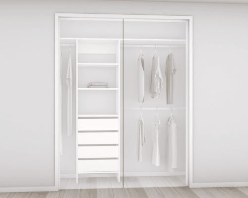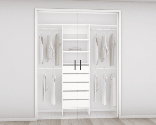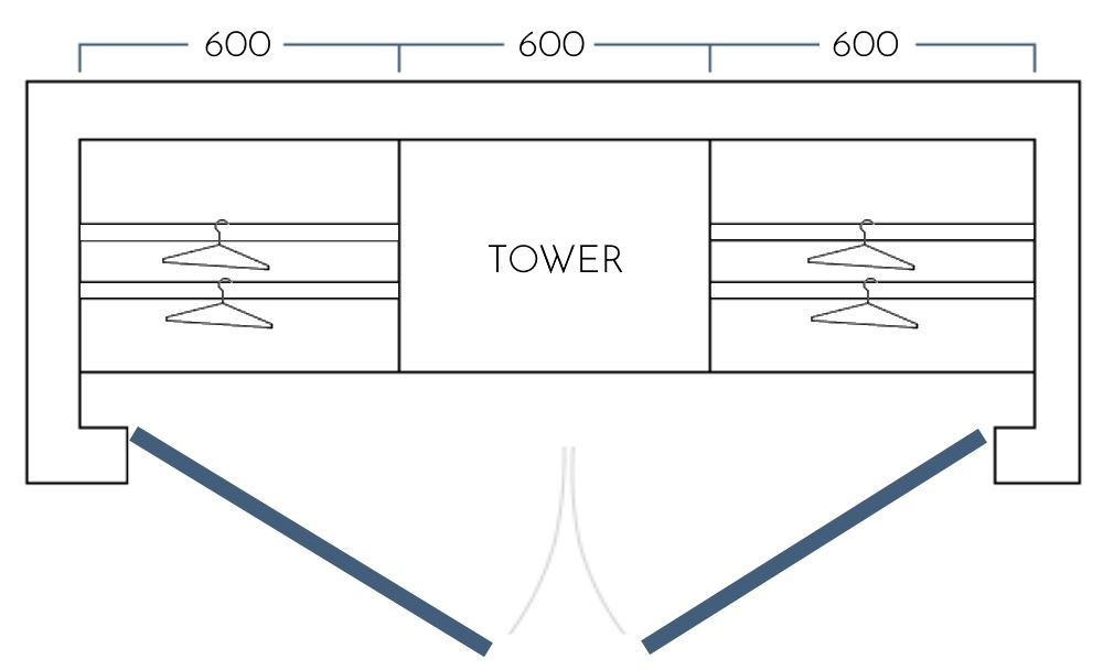 Let’s say you require one tower module, and the rest of the space you want to use for hanging clothes. If the tower module is 600mm (60cm) wide, then you will have 1200mm leftover. If you have hinged or bi-fold doors on your wardrobe you could place the tower in the centre, and have 600mm wide hanging either side. You could choose to have 2 hanging rails on one side of the tower (double hanging) and 1 rail on the other side (long hanging). Or if you have double sliding doors on your wardrobe then your tower module will need to be placed off-centre so the drawers make clearance of the door opening. In this case, you may choose to do 300mm wide of hanging on one side of the tower and 900mm of hanging on the other side of the tower. Be sure to measure the door opening size when your sliding doors are stacked open to ensure this will work. We recommend using a shelf tower (without drawers) in small wardrobes with double sliding doors.