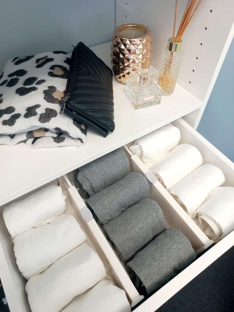 Using dividers not only keeps everything organised but also prevents you from wasting space. It’s much easier to find what you need when each item has its own designated spot, and you can fit more into your wardrobe without clutter.